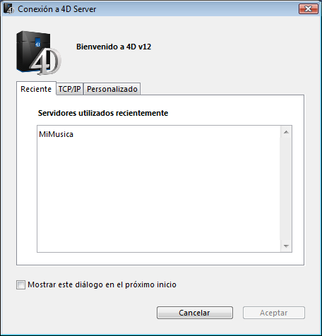 Si selecciona la opción Mostrar este diálogo en el próximo inicio, esta caja de diálogo se mostrará automáticamente al inicio de la aplicación 4D.