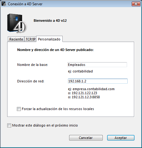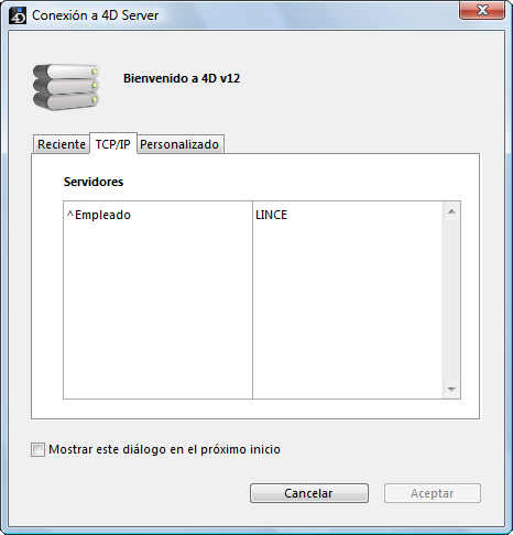 Nota: puede igualmente mostrar esta caja de diálogo haciendo clic en el enlace Conectarse a 4D Server en el diálogo de bienvenida de 4D.