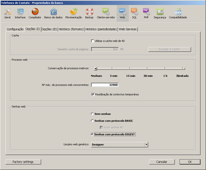 A escolha do modo de autenticação se realiza na página Web/Opções (I) da caixa de diálogo de Propriedades do banco: