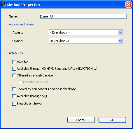 Esta opção está desmarcada por padrão ao criar um banco. Os métodos que podem ser executado utilizando a URL 4DACTION e as etiquetas 4D devem ser indicadas expressamente.
