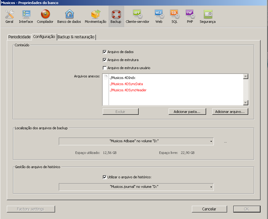 A página Página Backup/Configuração do aplicativo permite designar os arquivos de backup e sua localização, assim como do arquivo de histórico. Estes parâmetros são específicos para cada banco de dados aberto pelo aplicativo 4D.