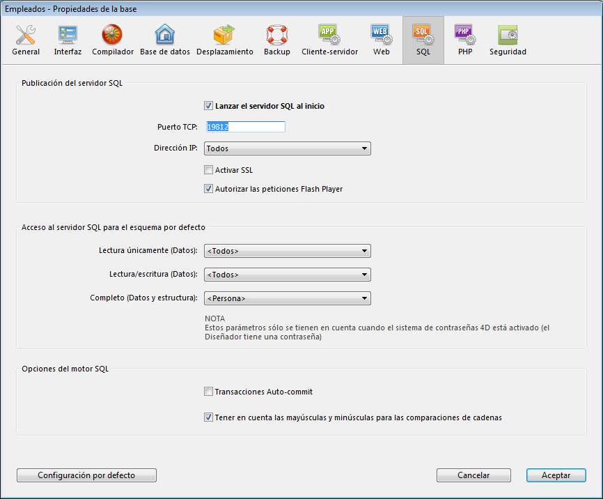 Puerto TCP: por defecto, el servidor SQL de 4D responde a las peticiones en el puerto TCP 19812. Si este puerto ya está siendo utilizado por otro servicio o si sus parámetros de conexión requieren de otra configuración, puede cambiar el puerto TCP utilizado por el servidor SQL de 4D. Nota: si pasa 0, 4D utilizará el número de puerto TCP por defecto, es decir 19812.