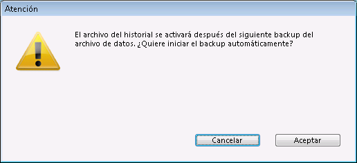 La activación de un nuevo archivo de historial requiere que los datos de la base sean guardados antes en una copia de seguridad. Cuando seleccione y valide esta opción, aparecerá una caja de diálogo de alerta para informarle que es necesario realizar un backup: