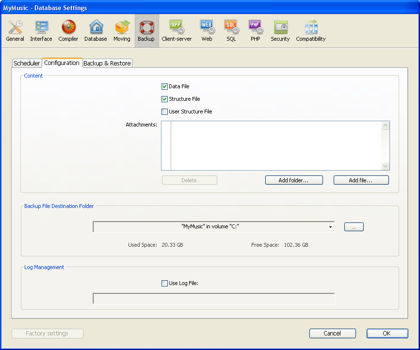 The Backup/Configuration page of the Database Settings lets you set the backup files and their location, as well as that of the log file. These parameters are specific to each database opened by the 4D application.
