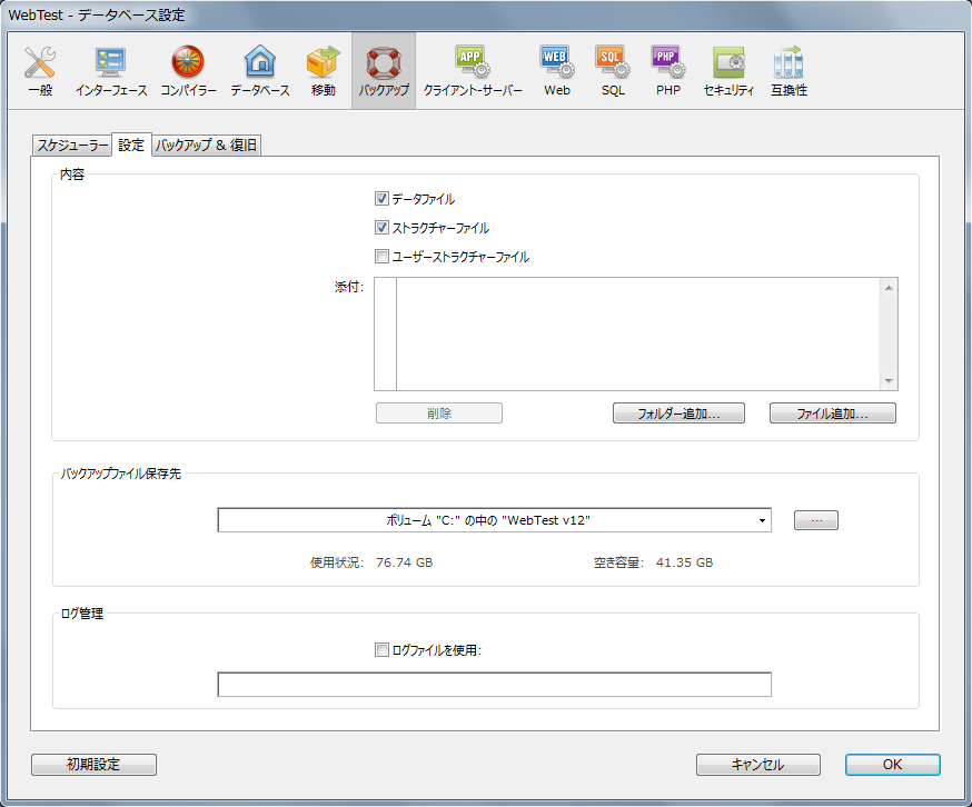 データベース設定のバックアップ/設定ページではバックアップやログファイルの有効化/無効化、および保存先を設定できます。これらのパラメーターは4Dアプリケーションで開かれる各データベースごとに設定されます。