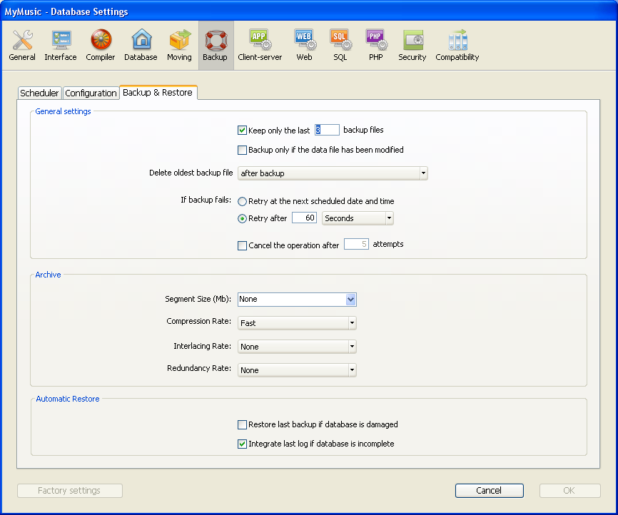 Note: In the case of an automatic restore, only the data file is restored. If you wish to get the attached files or the structure file, you must perform a manual restore.
