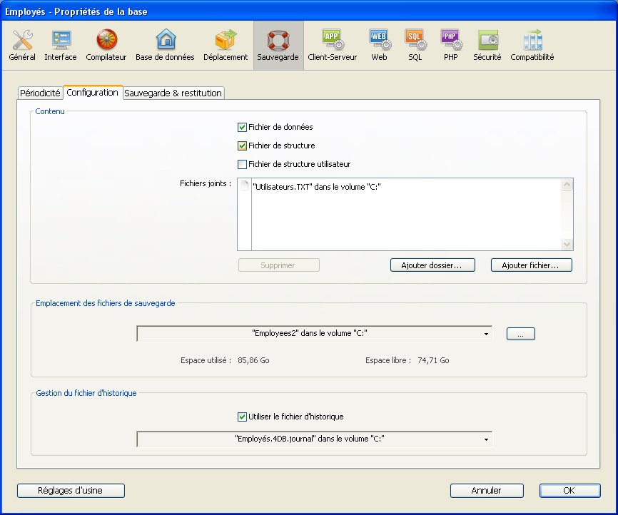 La Page Sauvegarde/Configuration des Propriétés de la base permet de désigner les fichiers à sauvegarder, l’emplacement des fichiers de sauvegarde et le fichier d’historique. Ces paramètres sont spécifiques à chaque base de données ouverte par l’application 4D.