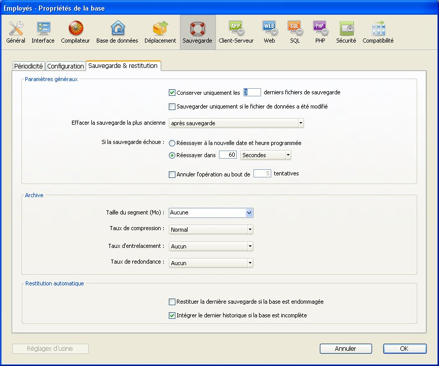 Les options de sauvegarde sont définies dans la Page Sauvegarde/Sauvegarde et restitution des Propriétés de la base :
