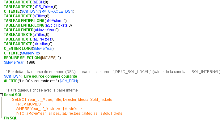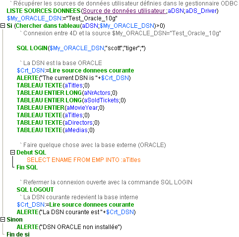 L'exemple suivant illustre la connexion à une source de données externe (ORACLE), la récupération de données depuis cette base ORACLE ainsi que la déconnexion de cette base et le retour à la base locale. Cet exemple suppose qu'une source de données externe valide nommée "Test_ORACLE_10g" est installée dans le système.