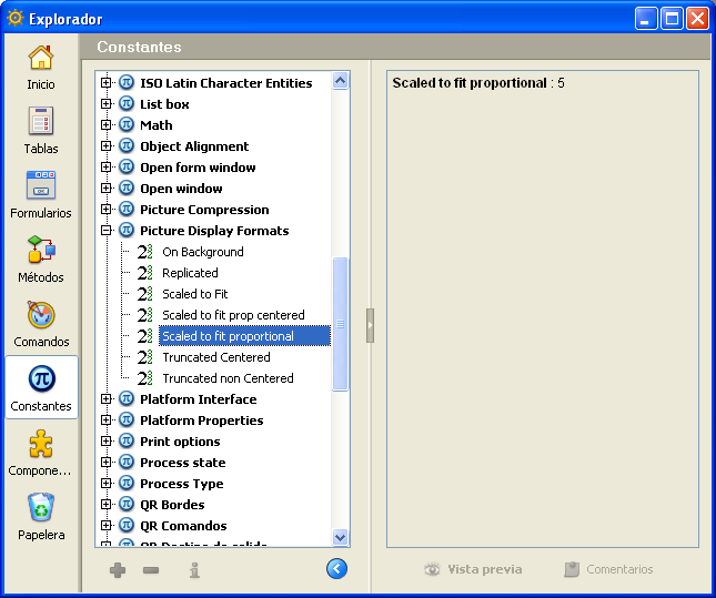 4D proporciona un conjunto de constantes predefinidas. Estas constantes están listadas en la ventana del Explorador: