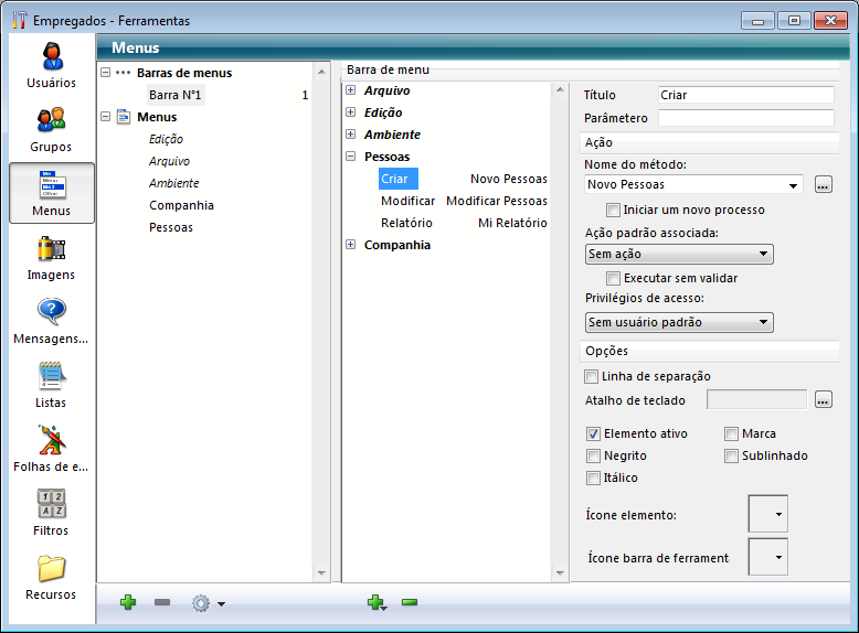 Menus personalizados são a principal parte da interface de uma aplicação. Eles tornam mais fácil para que os usuários aprendam a usar um banco de dados. Criar menus personalizados é muito simples, você associa métodos ou ações automáticas a cada comando de menu (também chamados de itens de menu) no editor de Menu.