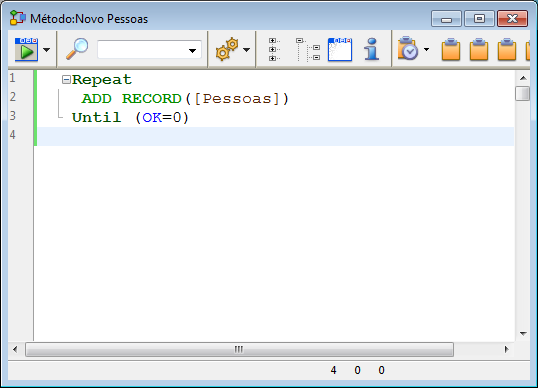O loop  com um comando ADD RECORD dentro do loop funciona como o item de menu Novo Registro  no ambiente de design. Ele exibe o formulário de entrada para o usuário, de modo que ele ou ela pode adicionar um novo registro. Quando o usuário salva o registro, outro novo registro em branco aparece. Este loop ADD RECORD continua a executar até que o usuário clique no botão Cancelar.