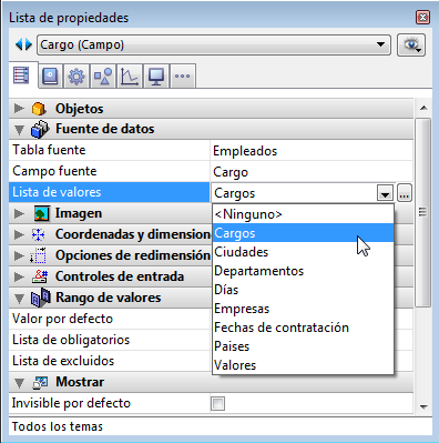 Si el objeto muestra una lista de valores (tal como un combo box, un área de desplazamiento, un menú desplegable, una pestaña, o una lista desplegable), puede especificar una lista de valores a utilizar como valores por defecto. Esta lista se cargará en el objeto antes de mostrarse en el formulario.