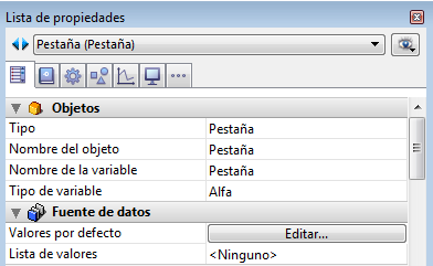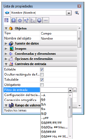 El contenido de la Lista de propiedades es contextual. Cuando el atributo Editable no está seleccionado en la Lista de propiedades, las propiedades relacionadas con el control de entrada de datos (Obligatorio, Tabulable, Filtro de entrada, etc.) desaparecen de la lista.