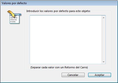 Escriba la lista de valores por defecto. Cada valor debe aparecer en una línea diferente. Haga clic en el botón Aceptar para cerrar la caja de diálogo y regresar a la ventana Lista de propiedades.