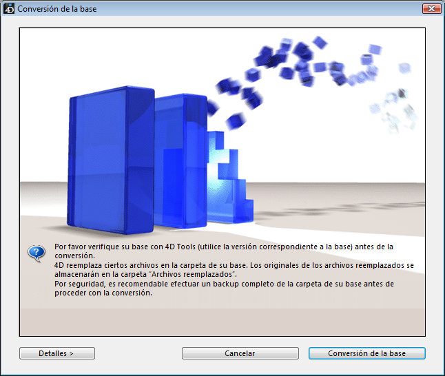 Los cambios estructurales realizados a nivel del motor de la base de datos de 4D a partir de las versiones 11 y 12 necesitan una conversión en profundidad de la estructura y de los datos de las bases anteriores. Por seguridad, este asistente efectúa una copia de la base de origen antes de la conversión de manera que pueda devolver la operación en cualquier momento.