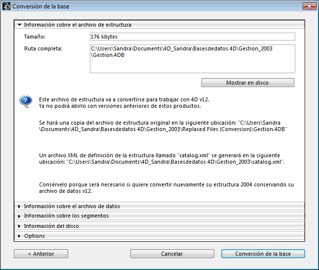 Al convertir una base antigua que contiene segmentos, el asistente de conversión agrupa los contenidos de todos los segmentos en un nuevo archivo de datos. Debe asegurarse de que tener una cantidad suficiente de espacio en disco para el nuevo archivo de datos.