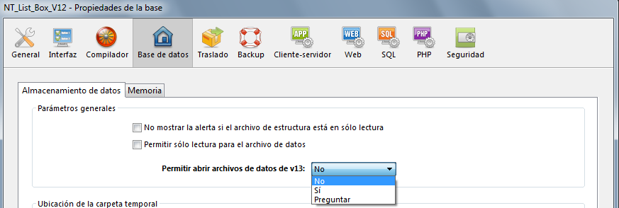 (*) Aún es posible reabrir en versión 12 un archivo de datos convertido con 4D v13. Esta posibilidad debe autorizarse explícitamente en la versión 12 utilizando la opción Permitir abrir archivos de datos de v13 en la página “Base de datos/Gestión de datos” de las Propiedades de la base: