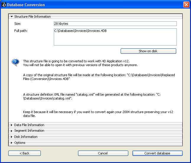 Catalog.xml: This file contains the description of the converted database structure as well as the new internal identifiers UUIDs used by 4D in version 12 (see Changing the data file). This file is required when you want to carry out several conversions of the structure while keeping the same data file. This can happen in the case where an application is developed in version 2004 with an initial conversion to v12 followed by successive conversions of the structure file during the development phase, while the converted v12 application is in use. Only the structure file is therefore converted subsequently. Warning:Using the Catalog.xml file to perform multiple conversions is a tricky operation that entails the risk of data loss in the event of a handling error. We recommend that you do not allow users to perform this operation on their own without immediate data verification. Generally, this specific mechanism must be reserved for particular cases; it is not recommended to continue development in version 2004 once deployment has been carried out in v11 or v12.