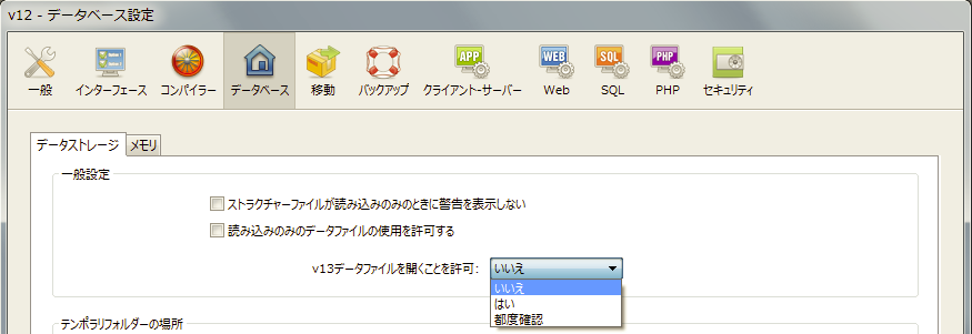 (*) v12で明示的に許可していれば、一度v13に変換したデータファイルをv12で開くことが可能です。この設定はデータベース設定のデータベース/データストレージ ページ内、v13 データファイルを開くことを許可設定を使用して行います: