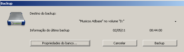O botão Propriedades do banco provoca a visualização da caixa de diálogo das Propriedades do banco (Página Backup/Configuração). - Clique no botão Backup para iniciar o backup utilizando os parâmetros atuais.