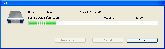 - Interrupção do usuário: o botão Parar na caixa de diálogo de progresso do backup permite aos usuários interromper o backup a qualquer momento. Neste caso, a cópia dos elementos é parada e gera-se um erro. Pode-se interceptar este erro no sistema de banco de dados Método de Banco de Dados On Backup Shutdown.