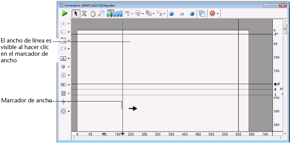 1. Defina el ancho de las etiquetas arrastrando el marcador de ancho situado en la regla horizontal del editor de formularios.