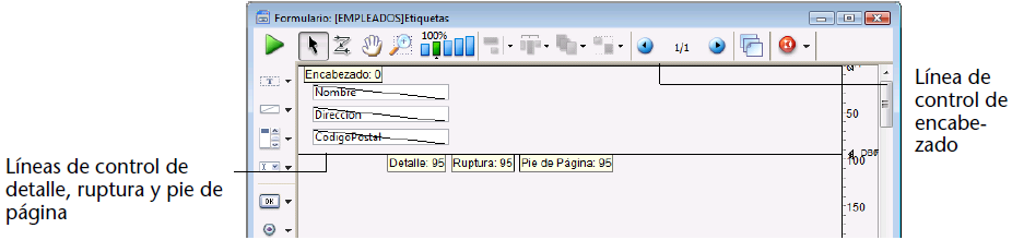 Cuando imprima las etiquetas, todo lo que esté entre las líneas de control de encabezado y de detalle aparece en las etiquetas.