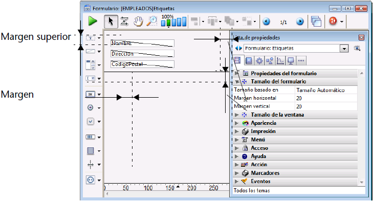 • Las márgenes derecha e inferior de cada etiqueta son determinadas por los valores Margen horizontal y Margen vertical definidos en la lista de propiedades del formulario.
