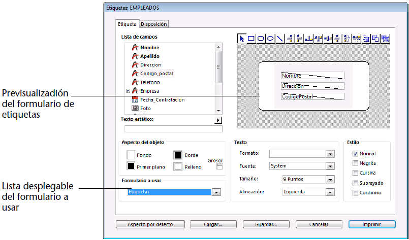 Para crear un formulario de etiquetas e imprimir utilizando el editor de etiquetas:
