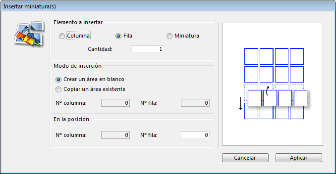 La librería de imágenes le permite insertar y borrar miniaturas en una secuencia de miniaturas creada previamente. Puede insertar miniaturas también como columnas y líneas.