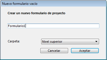 Puede crear directamente un formulario vacío desde el Explorador sin utilizar el asistente de creación de formularios. En este caso, el formulario se crea sin campos, botones o variables y se abre en el editor de formularios donde puede construirlo totalmente. Crear formularios vacíos es útil para generar cajas de diálogo que sólo contengan variables o áreas de plugin.