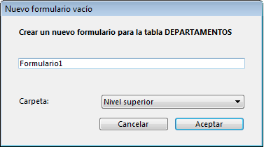 Si selecciona un nombre de carpeta, el formulario se ubicará en esta carpeta. Las carpetas permiten organizar los objetos de sus aplicaciones y se administran en la Página Inicio del Explorador. Por defecto, se crea el formulario en el nivel superior, es decir, fuera de las carpetas.