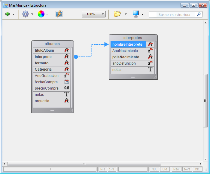 4D muestra la relación como una flecha entre dos tablas en el editor de estructura. La forma del conector de origen y final como también los caracteres N y 1 indican la dirección de la relación: