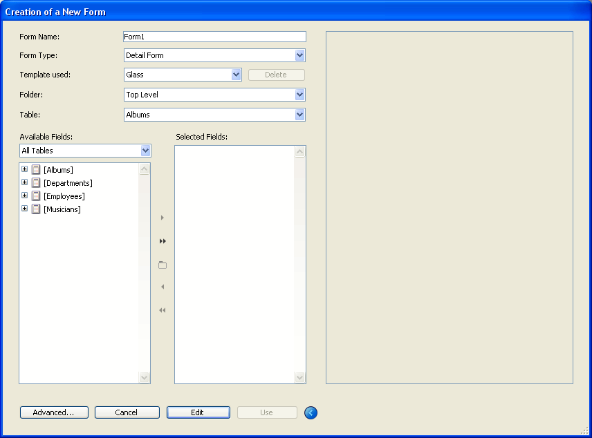 To display the advanced options of the Form Wizard, click on the Advanced... button on the basic screen of the Wizard. If you want to go back to the first screen of the Form Wizard, you can do so by clicking the < Back button.