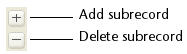 • Addition and Deletion Buttons: The Wizard automatically inserts two buttons in the form (corresponding to the button family specified for the form), which are associated with the Add Subrecord and Delete Subrecord standard actions: