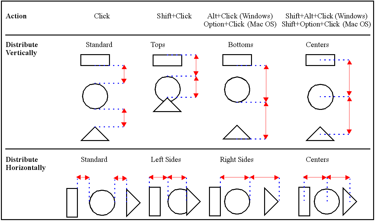 By default, a constant interval is set on based on the edges of the selected objects. You can also distribute objects based on their tops, bottoms or centers as shown in the following diagram: