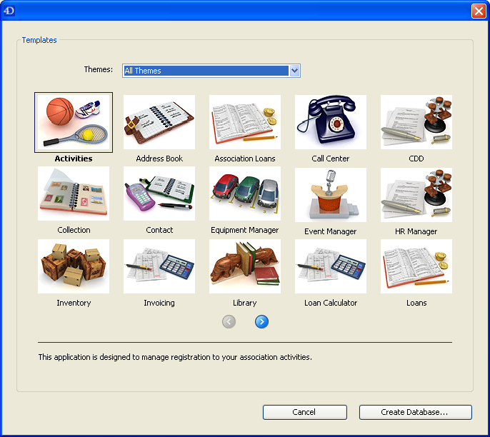 Note: Database templates are stored in a folder named “4D Modèles” or “4D Templates”. This folder must be placed at the same level as the .exe file of the 4D application (under Windows) or the package (under Mac OS). If this folder is missing, a blank window appears. - Select a template from the themes provided and click on Create Database...