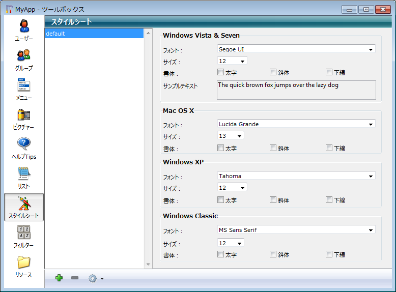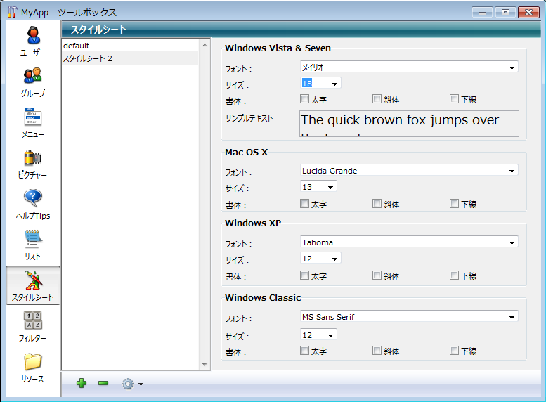 4. スタイルシート設定エリアにおいて、データベースの各オペレーティングシステムごとに目的のフォント、フォントサイズ、書体のオプションを選択します。