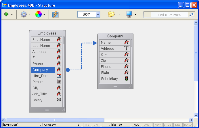 4Dはストラクチャーエディターの2テーブル間にリレーションを作成し、矢印で描画します。コネクターの始点および終点の形状、およびNや1の文字でリレーションの方向を判断できます: