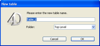 いつでもテーブルを作成することができます。4Dは作成されたテーブルに[Table_1]と名前を付け、次にテーブルを作成する際にその番号が存在すれば番号をインクリメントします。テーブル名は変更することができます。