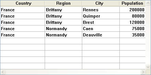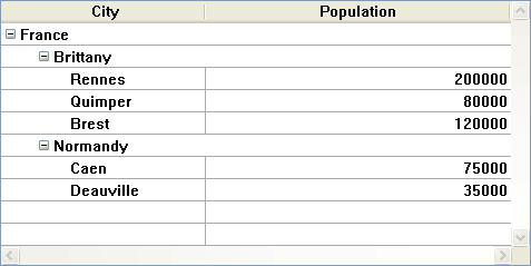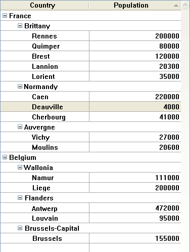 配列中で値が繰り返されていると、ブレーク行と階層"ノード"が自動でリストボックスに追加されます。例えばリストボックスに都市に関する4つの配列が含まれていて、それぞれ国、地域、都市名、人口データが含まれているとします: