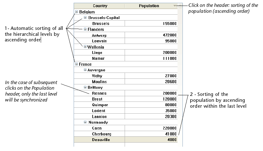 • その後の非階層列のソート時には、一番目の最後のレベルのみがソートされます。この列のソートはそのヘッダーをクリックすることで行えます。
