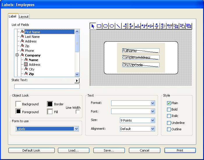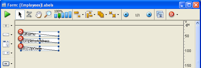 このラベルには変数が配置され、その値はオブジェクトメソッドで計算されます。例えばFullName変数のメソッドではレコードの姓と名フィールドの値を結合します: