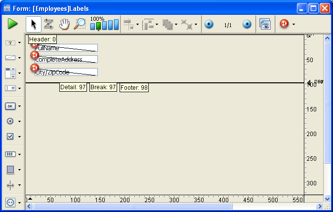ラベルに印刷する要素は幅マーカーの左側に配置されなければなりません。 - ヘッダーマーカーをフォームの最上部に、詳細/ブレーク/フッターマーカーをラベルの高さになるように設定します。