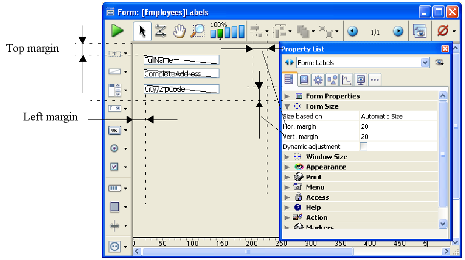 ラベルエディターはフォーム上のオブジェクトの絶対座標と設定されたマージンのみを考慮します。マーカーは無視されます。