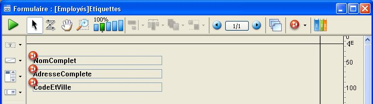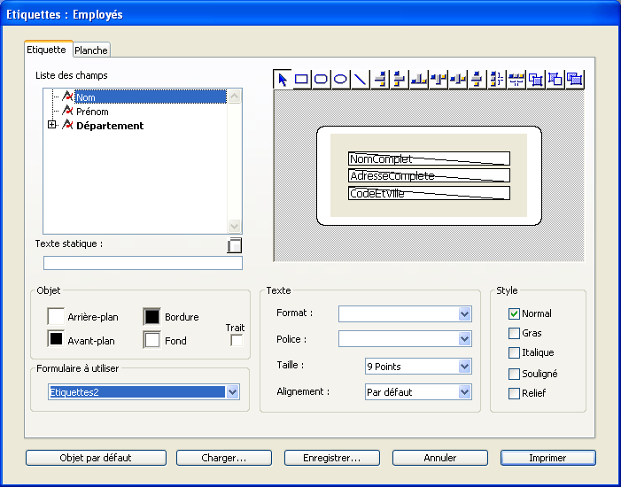 Les étiquettes peuvent contenir des champs et des objets actifs (auxquels vous pouvez ou non associer des méthodes), ainsi que des objets graphiques et du texte statique. Un sous-formulaire ne peut pas être imprimé dans une étiquette.
