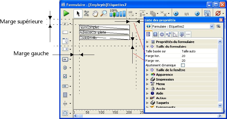 • la marge droite et la marge inférieure de chaque étiquette est déterminée par les valeurs Marge hor. et Marge ver. définies dans les Propriétés du formulaire.