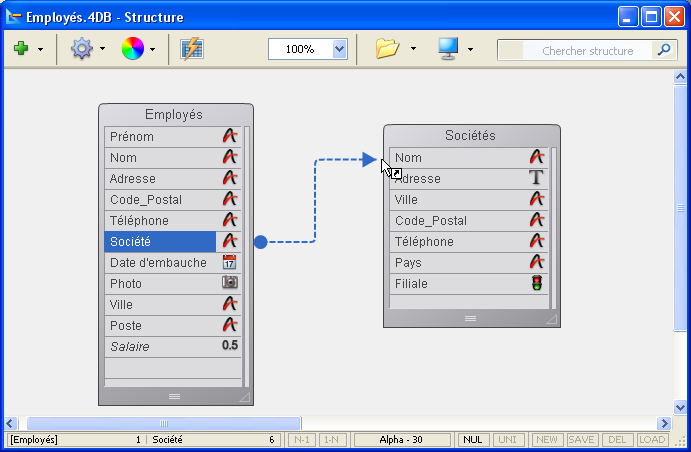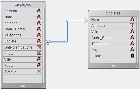 4D affiche le lien sous forme de flèche entre les deux tables dans la fenêtre de structure, comme illustré ci-dessous. La forme du connecteur de départ et les caractères N et 1 insérés dans les connecteurs précisent le sens du lien :