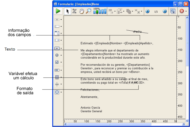 É possível controlar as tarefas de fusão de correio utilizando um formulário de saída que integre os campos, as etiquetas de campos ou tabelas ou variáveis em uma área de texto estática. É possível criar documentos idênticos exceto pelos nomes, os endereços e todo cálculo que você quiser realizar.